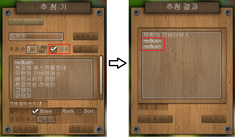 • 중복 체크 한 상태에서 추첨 시작 했을 때 사진 -> 결과 값 중복되서 나옴