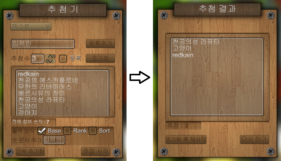 • 왼쪽 사진 : 추첨 할 이름들 입력 한 상태
