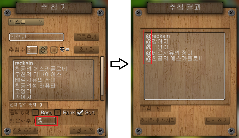• 첫 문자 추가 : 입력 박스에 문자 입력해 놓고 추첨 시작 -> 결과 값 앞에 해당 문자 추가 됨