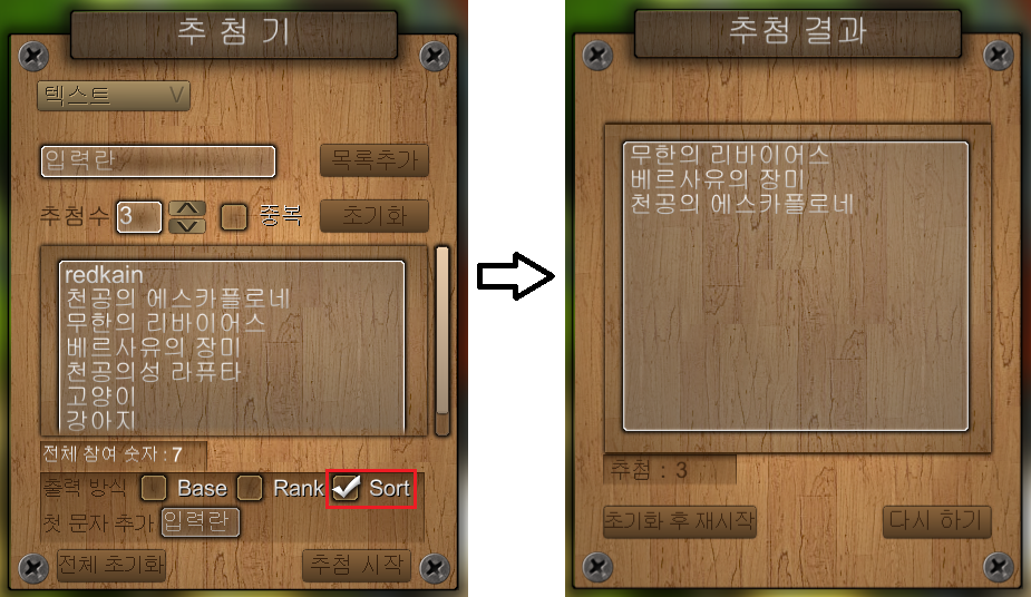 • Sort 체크 한 상태에서 추첨 시작 했을 때 사진 -> 결과 값이 ㄱㄴㄷ 순서대로 정렬 됨
