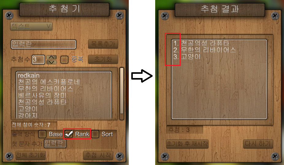 Rank 체크 한 상태에서 추첨 시작 했을 때 사진 -> 결과 값 앞에 숫자 붙어서 출력 됨