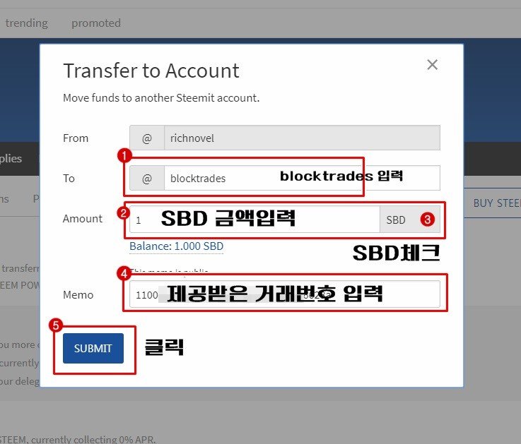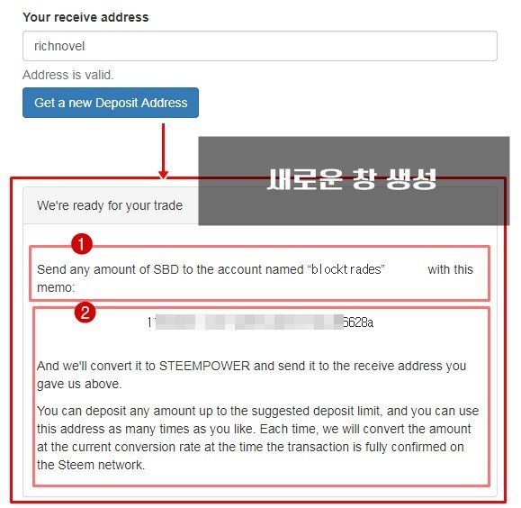 받은 거래주소와 SBD를 "blocktrades"라는 계정으로 보내면 되는 것 같네요. ^^