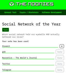 klye(25)•in #news•2369 days agoHelp Steemit Win the Noonies Social Network Platform of the Year Award( A screencap from hackernoon.com showing their voting list, click image to visit site and vot...4245$5.31klye(25)•in news•2369 days agoHelp Steemit Win the Noonies Social Network Platform of the Year Award( A screencap from hackernoon.com showing their voting list, click image to visit site and vot...4245$5.31