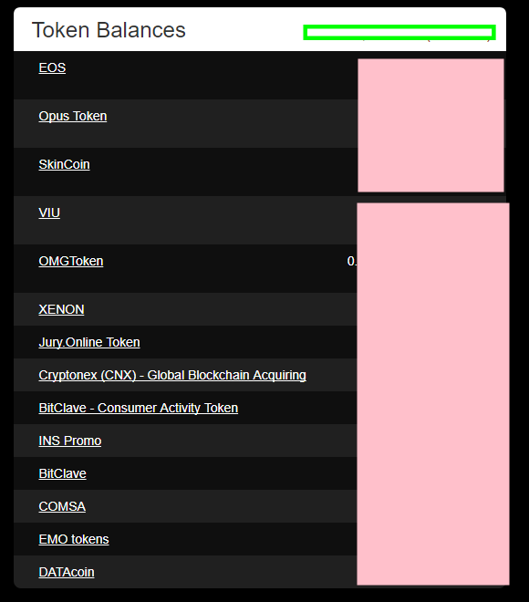 제가 받은 ERC-20 토큰들인데 수량은 나름 비밀인지라 핑크 박스안에 있어요 ㅎㅎ
