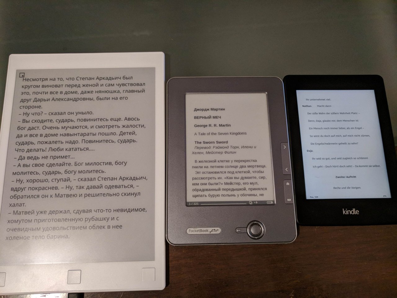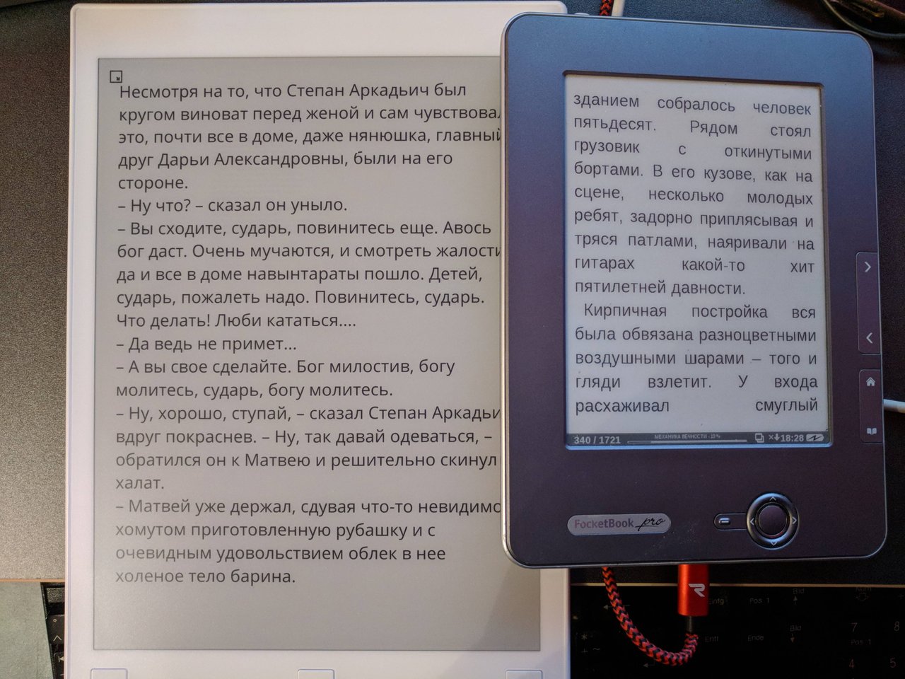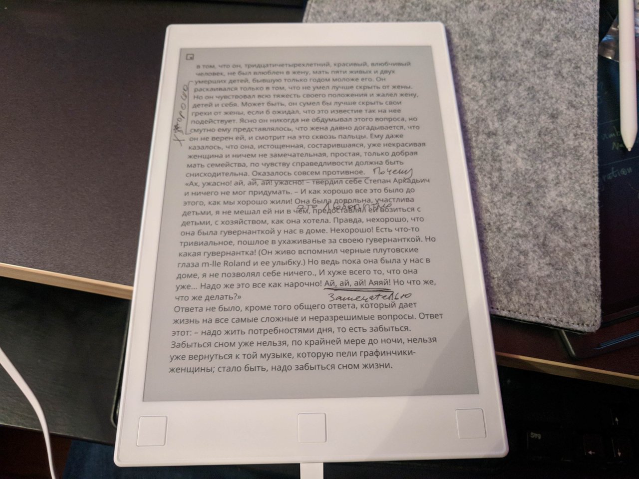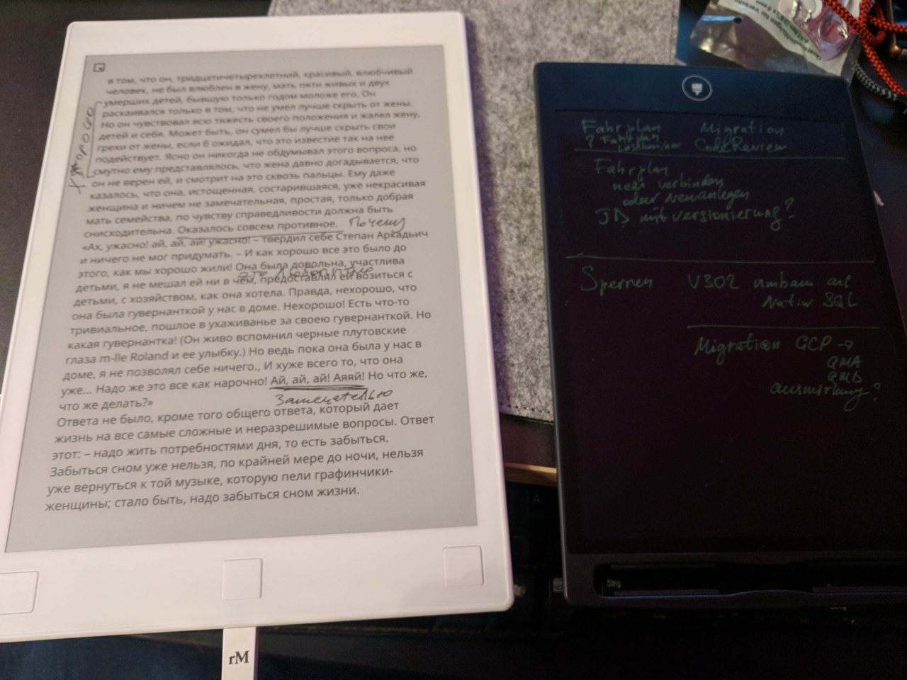 А вот рядом с pocketbook-ом. Как читалка я думаю reMarkable никакой. Во первых здоровый. Такой большой экран имхо для читалки не нужен. Во вторых экран какой то серый, даже в сравнении со стареньким покетбуком, не говоря уже про относительно недавний киндл. Подсветки тоже нет. Приложение для чтения книг тоже совсем простенькое. Долго загружает книгу, если поменять размер шрифта, то очень долго пересчитывает все. Пол минуты на Анну Коренину тратится. Читать на нем книги я не буду. Только может PDF-ы. на PDF-ах можно делать заметки поверх, но они опять же зачаточные. Нельзя отмечать слово, а можно только обвести его. Каталог заметок не создается.То-есть надо листать PDF, что бы найти заметку. Если шрифт поменять, то все заметки становятся ни к селу ни к городу. . В том же покетбуке семилетней давности заметки более продвинутые.