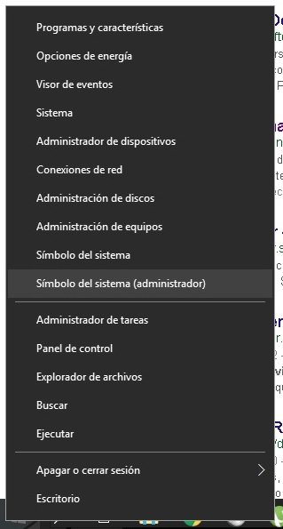 Debemos empezar usando el símbolo del sistema como administrador una manera fácil de llegar a él es usando el clip derecho sobre el icono de WINDOWS.