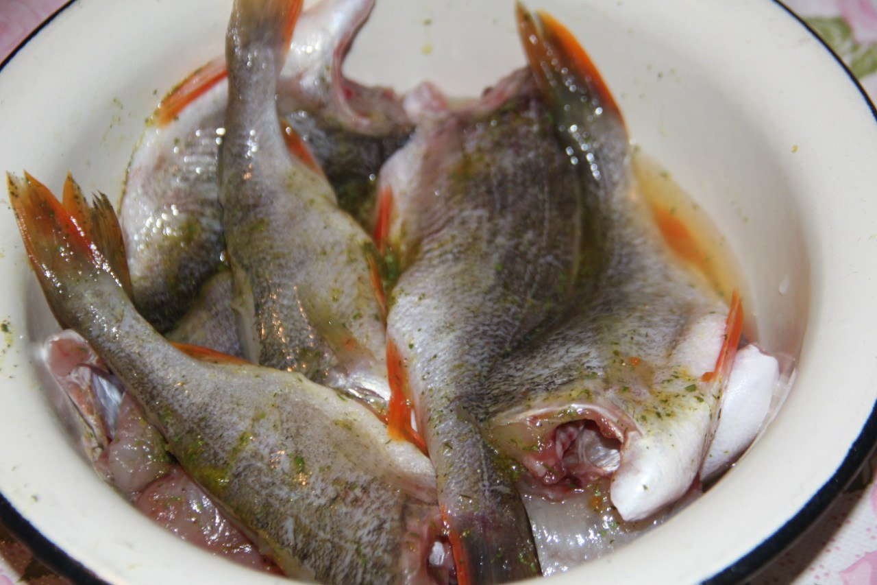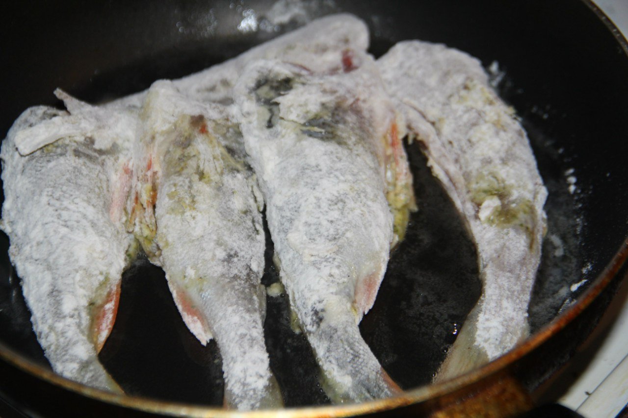 2. Flour mixed with salt and pepper. Coat the perch in flour, fry on high heat in vegetable oil for 5 minutes each side. Then cover with a lid and keep on slow fire 5-7 minutes.