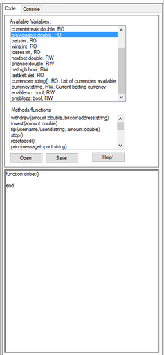 seuntjie(25)•in #dicebot•3449 days agoDicebot Programmer mode tutorial 04 - Martingale (and mini If tutorial)In the previous tutorial, we made a basic martingale script. Lets expand on that script a bit using variables. So the previous script: function dobet() if...10$0.00seuntjie(25)•in dicebot•3449 days agoDicebot Programmer mode tutorial 04 - Martingale (and mini If tutorial)In the previous tutorial, we made a basic martingale script. Lets expand on that script a bit using variables. So the previous script: function dobet() if...10$0.00