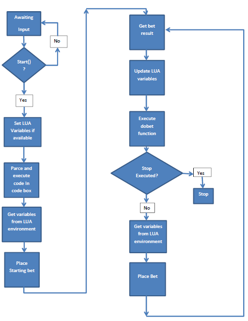 - Execute dobet: the LUA dobet function is executed. the nextbet variable determines the size of the next bet, with chance determining the chance to win and bethigh determining whether the bet were to be high or low. Any predefined function called at this stage is executed in series, meaning they're executed and only continue with the script once finished. For functions like resetseed, this could cause delays and "hangs" in the bot.