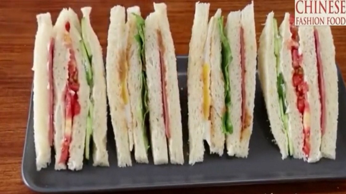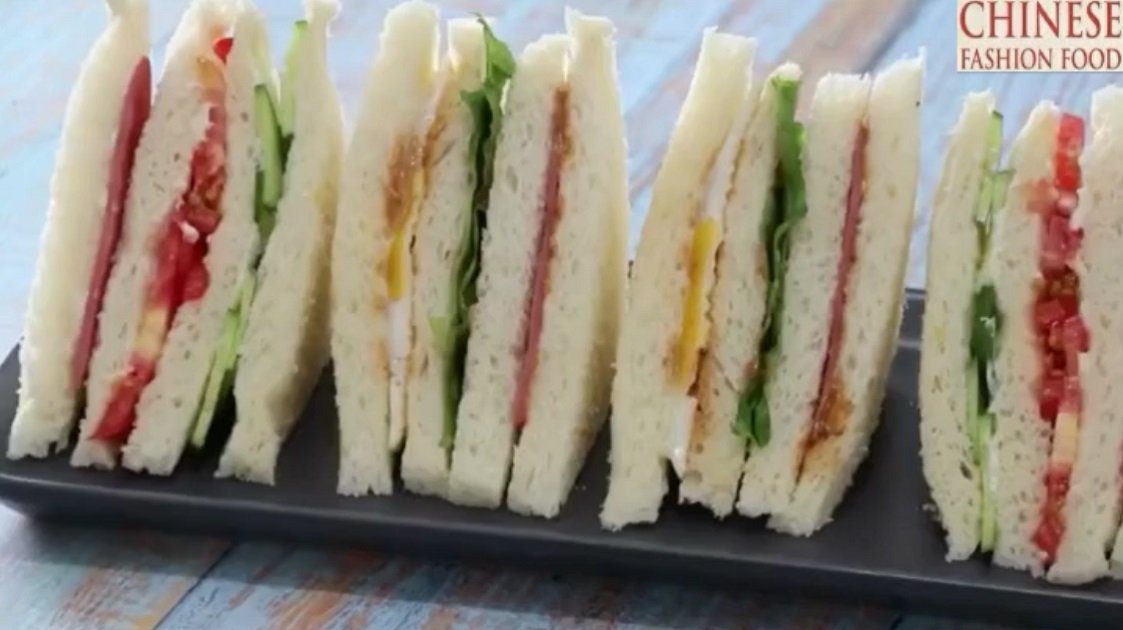 4: Put the salad dressing and ham on the toast, then add the toast, lettuce, salad dressing, tomato, cucumber and egg;
