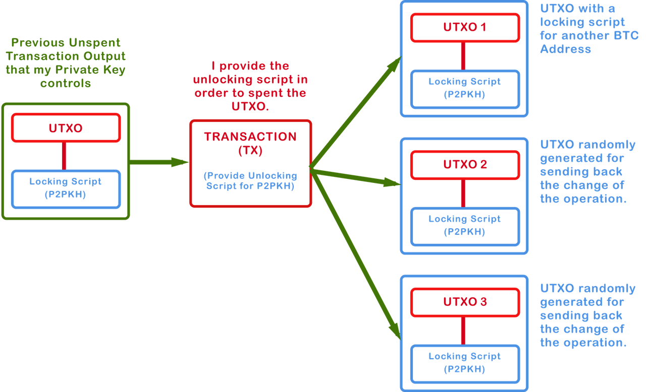 With that being said, most of the transactions in the bitcoin network are locked with a Pay-to-Public-Key-Hash or “P2PKH” script. These outputs contain a locking script that locks the output to a bitcoin address. An output locked with a “P2PKH” script can only be spent by presenting the public key and digital signature created by the corresponding private key.