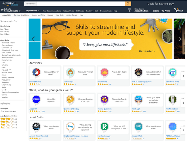 아마존은 두 가지 방식으로 음성 인터페이스와 AI를 사용할 수 있도록 공개하고 있다. 하나는 Alexa Skills Kit을 이용하는 방법과 Alexa Voice Service를 이용하는 것이다. Alexa Skills는 자사의 제품이나 서비스를 위한 앱을 개발하여 등록하면, 알렉사 에코와 같은 음성인식 기기에서 실행할 수 있게 하는 것이다. 예를 들면, BBC의 뉴스 요약 스킬은 음성으로 뉴스를 듣고 싶을 때 에코를 호출하면 요약 뉴스를 읽어주는 서비스이며, 우버를 호출할 수도 있고, 각종 온도계, 전등 등의 스킬과 연계하여 알렉사 에코를 통해서 음성으로 제어할 수 있게 하는 것이다. 보이스 서비스는 음성인식을 위한 마이크와 스피커를 기기 자체 내장하고 있으며, 이를 알렉사의 인공 지능 플랫폼에 연동하는 서비스이다. 알렉사 스킬스는 2014년에 아마존 에코와 함께 제공되었으며, 2017년 2월 약 8 천개의 스킬스가 등록이 되었다. 이후 2018년 5월 약 3만개가 등록되었다. 아마존 보이스 서비스를 내장한 기기는 2017년, 2018년 CES에서 여러 제조사가 선보이며, 아마존이 참여하지 않았음에도 불구하고 진정한 승자라는 평가를 받게 된다. 화웨이 스마트폰, LG전자 냉장고, 레노버 인공지능 스피커, GE의 LED 링 램프 등 알렉사를 내장하거나 연동기능을 갖춘 가전 제품과 포드 자동차, 가전회사 월풀 제품 등이 알렉사와 연동하는 제품을 선보였다. 또한 전구, 로봇청소기, 커피메이커 등 알렉사를 활용한 기술 및 응용 프로그램을 개발한 회사가 수천 개에 달한다는 보도가 있었다.