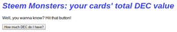 smitop(25)•in #steemmonsters•2392 days agoWant to know your SM cards total DEC burn value?Well, now you can know! Just use my new tool. Here's what it looks like: It determines how much DEC you could get from each card in your collection if you burne...1smitop(25)•in steemmonsters•2392 days agoWant to know your SM cards total DEC burn value?Well, now you can know! Just use my new tool. Here's what it looks like: It determines how much DEC you could get from each card in your collection if you burne...1