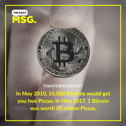 socialspace(25)•in #bitcoin•2950 days agoIn May 2010, 10 000 Bitcoins would get you two pizzas. In May 2017, 1 Bitcoin was worth 20 million pizzas....62$0.00socialspace(25)•in bitcoin•2950 days agoIn May 2010, 10 000 Bitcoins would get you two pizzas. In May 2017, 1 Bitcoin was worth 20 million pizzas....62$0.00