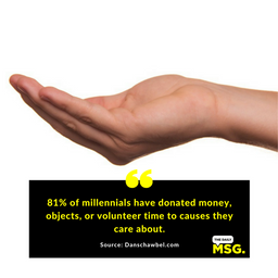 socialspace(25)•in #blog•2956 days ago81% of millenials have donated money, objects or volunteer time to causes they care about....70$0.03socialspace(25)•in blog•2956 days ago81% of millenials have donated money, objects or volunteer time to causes they care about....70$0.03