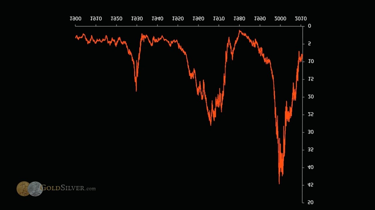 위 Dow In Gold 그래프를 뒤집으면, 금값의 구매력(Gold In Dow)을 나타낼 수 있다.