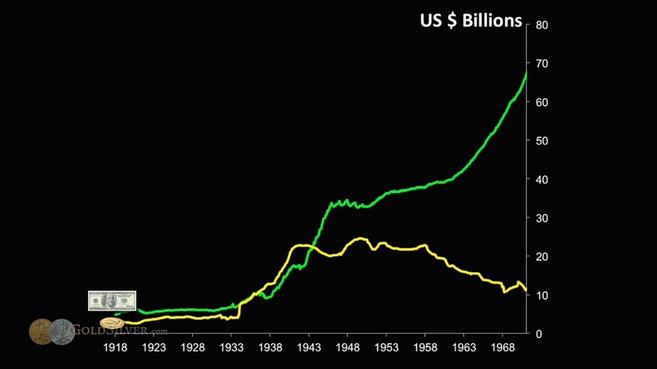 실제로 아래 초록색, 그리고 파란색 라인이 달러 화폐량의 추이이며, 금값이 지속적으로 화폐량에 맞춰 따라오는 것을 볼 수 있다.
