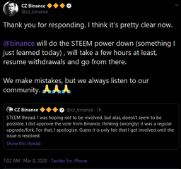 ausbitbank(25)•in #steemhostiletakeover•2136 days agoBinance backs down publicly, announces powerdown, admits mistakehttps://twitter.com/czbinance/status/1236396874690695173 https://twitter.com/czbinance/status/1236397951628558338 Plz help reward positive behaviours :) Watchin...11ausbitbank(25)•in steemhostiletakeover•2136 days agoBinance backs down publicly, announces powerdown, admits mistakehttps://twitter.com/czbinance/status/1236396874690695173 https://twitter.com/czbinance/status/1236397951628558338 Plz help reward positive behaviours :) Watchin...11