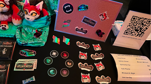 On-site merch included Yodin plushies, miniature Dr. Blights, any extra swag (stickers, splinterfest tees, and splinterfest bags). There was also an area for community member Chipmunk to sell his wood burned cards. Physical chaos legion packs were given out in swag bags and as scavenger hunt prizes.