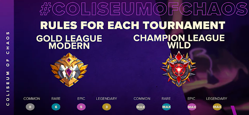 The Coliseum of Chaos introduced a new tournament mode that gives all players access to all max level cards in a set (restricted to their respective league level).