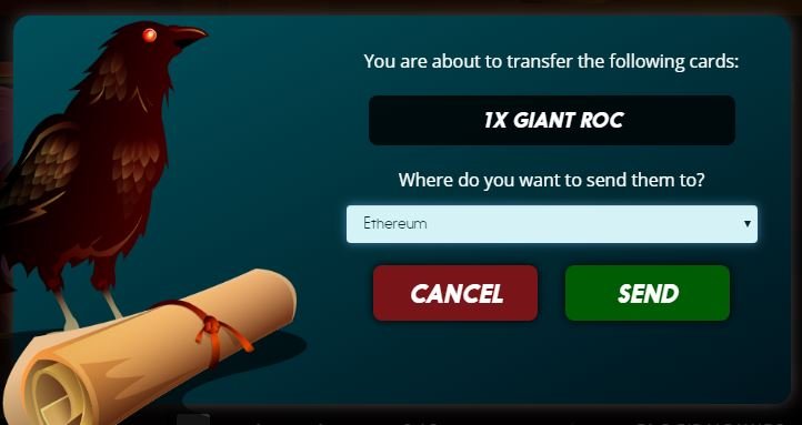 If you want to send cards from your Ethereum wallet back into the game so that they may be played, you can once again select the card in the card details view and choose the "Send" option which will allow you to transfer them back into the game. Transferring cards from Ethereum into the game requires you to sign and broadcast a transaction to the Ethereum blockchain. This requires you to have some Ether (ETH) tokens in your Ethereum wallet in order to pay the transaction fees (known as gas).