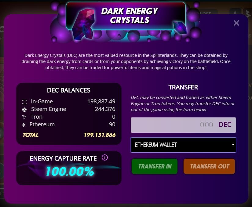 Just as with the cards, transferring DEC in to the game from your Ethereum wallet will require broadcasting a transaction to the Ethereum blockchain which will require some Ether (ETH) to be spent for the transaction fees.