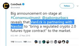 steemchoose(25)•in #crypto•2603 days agoCrypto news 2018/11/28 VanEck is partnering with Nasdaq1. VanEck is partnering with Nasdaq According to coindesk, today at the Consensus Invest conference, Van Eck's digital asset director and strategist Gabor Gurba...9steemchoose(25)•in crypto•2603 days agoCrypto news 2018/11/28 VanEck is partnering with Nasdaq1. VanEck is partnering with Nasdaq According to coindesk, today at the Consensus Invest conference, Van Eck's digital asset director and strategist Gabor Gurba...9