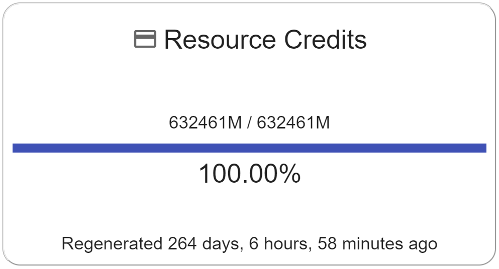 This panel was suggested by our users after the launch announcement. You asked, we answered! Your current resource credits regeneration percentage is shown. If your RC mana is less than 100%, the component will show the time remaining before your mana regenerates completely. If your RC mana is at 100%, the component will show how much time has passed since your mana regenerated completely.