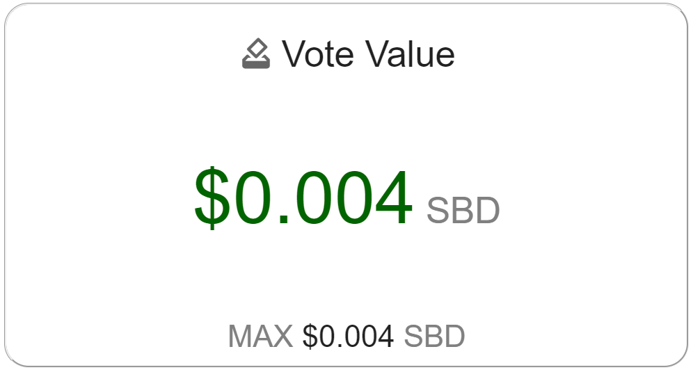 Shows how much your 100% upvote is currently worth in SBD. Based on @yabapmatt's calculation method. This value will change depending on your current voting power percentage. The value at the bottom of the panel shows how much your vote is worth when your VP is at 100%.