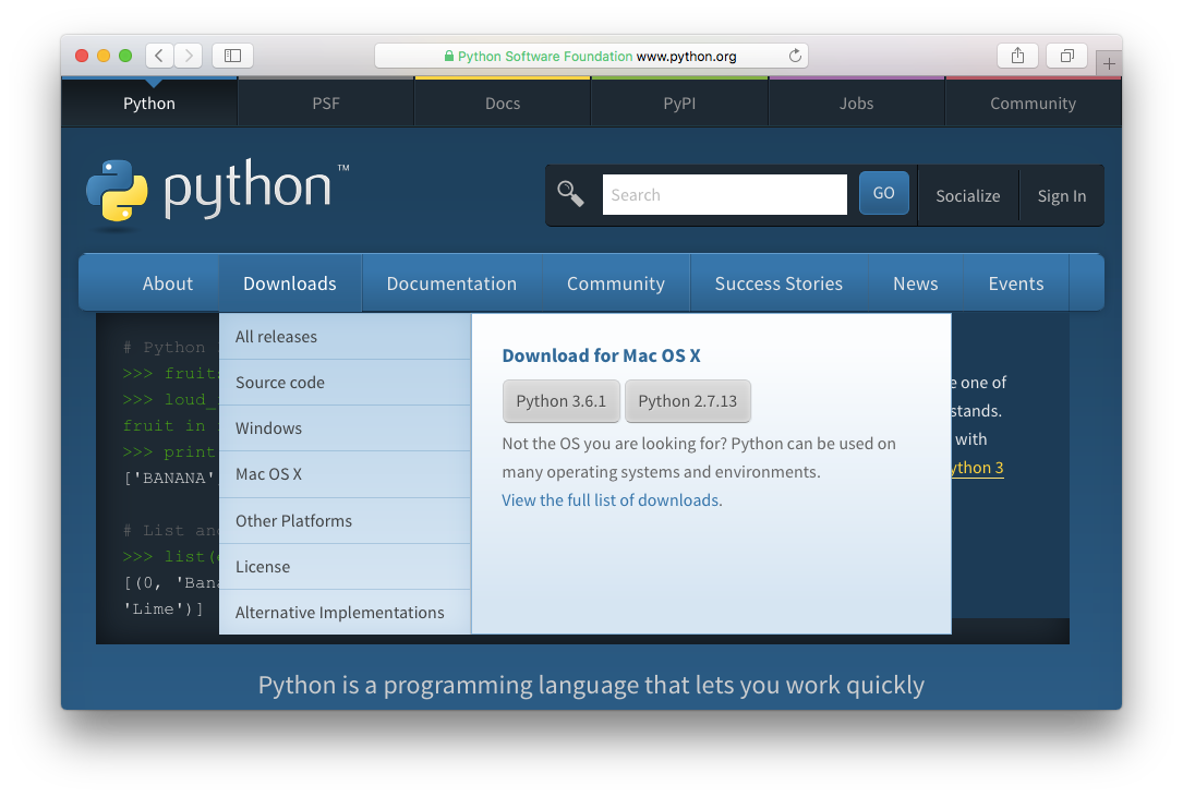 웹 페이지의 메뉴 중 Downloads를 선택하면 자신의 운영체제 맞는 파이썬 실행 환경을 설치할 수 있다. 파이썬은 현재 2.y.z 버전과 3.y.z 버전이 공존하고 있는데 파이썬을 처음 시작하는 우리는 하위 호환성을 고려할 필요가 없으므로 파이썬(Python) 3.y.z 버전을 다운로드하도록 한다.