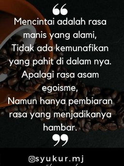 syukurmj(25)•in #esteem•2723 days agoKumpulan puisi (Collection of poetry)Mencintai adalah rasa manis yang alami Tidak ada kemunafikan yang pahit di dalamya Apalagi rasa asam egoisme Hanya saja, pembinaan rasa yang menjadikanya hambar...144$0.00syukurmj(25)•in esteem•2723 days agoKumpulan puisi (Collection of poetry)Mencintai adalah rasa manis yang alami Tidak ada kemunafikan yang pahit di dalamya Apalagi rasa asam egoisme Hanya saja, pembinaan rasa yang menjadikanya hambar...144$0.00