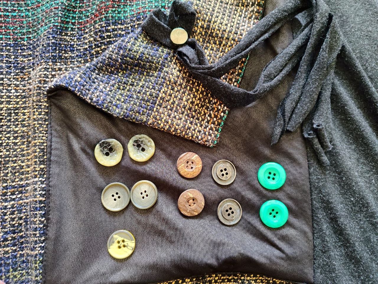 The last stage of this project was working with the neckline. In my opinion, the neckline of the dress was too stretched and did not lie nicely. So I decided to make a couple of tucks and hide them with buttons. I checked my button stock and it turned out that there were many options. I was even a little confused about which one to choose.