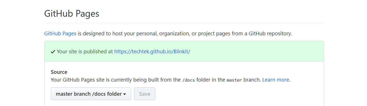 On the Blinkit Github repository the option "Github pages" is activated, and the new Blinkit website is uploaded in the default docs folder.