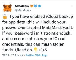 thekhansoft(25)•in #hive-161155•1385 days agoMetaMask recommendations for Apple Devices' OwnersThe developers of the MetaMask wallet recommended that owners of Apple devices disable data backup to iCloud in the application settings....10$0.00thekhansoft(25)•in hive-161155•1385 days agoMetaMask recommendations for Apple Devices' OwnersThe developers of the MetaMask wallet recommended that owners of Apple devices disable data backup to iCloud in the application settings....10$0.00