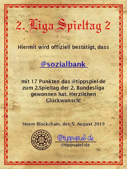 tippspiel-de(25)•in #deutsch•2342 days agoTippspiel 2. Bundesliga Spieltag 4 - Gewinne bis zu 20 SBI uvm.In Liga 2 steht für das kommende Wochenende der 4. Spieltagas. Natürlich gibt es wieder ein Tippspiel für euch! Auf den Gewinner warten bis zu 20 SBI Anteile (s...4532$0.05tippspiel-de(25)•in deutsch•2342 days agoTippspiel 2. Bundesliga Spieltag 4 - Gewinne bis zu 20 SBI uvm.In Liga 2 steht für das kommende Wochenende der 4. Spieltagas. Natürlich gibt es wieder ein Tippspiel für euch! Auf den Gewinner warten bis zu 20 SBI Anteile (s...4532$0.05