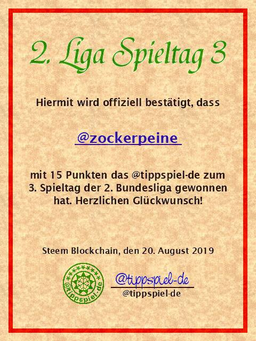 tippspiel-de(25)•in #deutsch•2342 days agoGewinner 2.Liga Spieltag 3 des @tippspiel-deDiesmal etwas verspätet die Auswertung des 3. Spieltags der 2. Bundesliga: Die Endergebnisse des 1. Spieltags: Hamburg - Bochum 1:0 Sandhausen - Nürnberg 3:2 Wi...4417$0.02tippspiel-de(25)•in deutsch•2342 days agoGewinner 2.Liga Spieltag 3 des @tippspiel-deDiesmal etwas verspätet die Auswertung des 3. Spieltags der 2. Bundesliga: Die Endergebnisse des 1. Spieltags: Hamburg - Bochum 1:0 Sandhausen - Nürnberg 3:2 Wi...4417$0.02