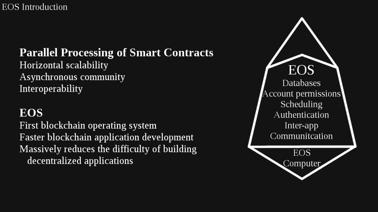 EOS는 합의화된 블록체인 운영체제로 데이터베이스, 계정 권한 관리, 스케쥴링, 인증, 인터넷 애플리케이션 통신을 제공하여 소규모 사업 개발의 효율을 증대시키고, 병렬처리를 통해 수백만명의 사용자가 수백만건의 트랜잭션을 초당 처리하도록 블록체인의 확장성을 가능하게 합니다.
