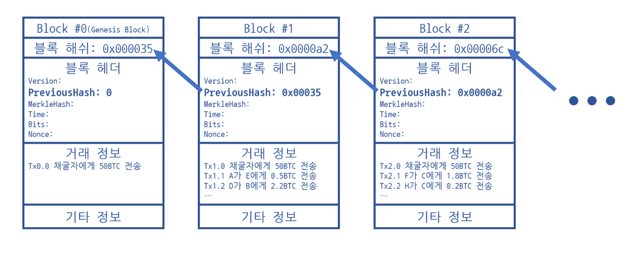 블록 체인은 앞에서는 거대한 분산 공개 장부라고 했는데, 기술적으로는 블록이 이어져서 만들어진 블록의 집합체라고 말할 수 있다.블록들은 어떻게 이어져 있는걸까? 앞에서 살펴본 블록 헤더의 6가지 정보 중의 하나인 previousblockhash 값은 현재 생성하고 있는 블록 바로 이전에 만들어진 블록의 블록 해쉬값이다. 블록은 바로 앞의 블록 해쉬 값을 포함하는 방식으로 앞의 블록과 이어지게 된다.