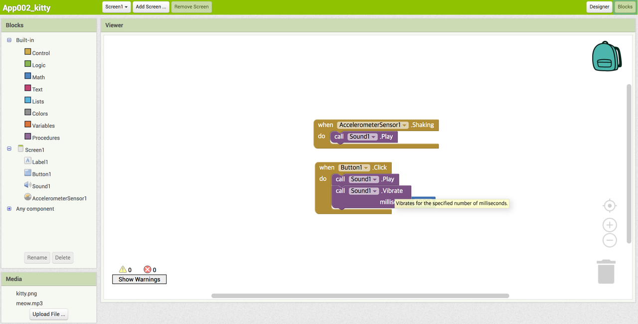 첫번째 블록은 AccelerometerSensor를 흔들면 sound1이 play하라는 코딩이다. 두번째 블록은 button1을 클릭하면 소리가 나면서 1초 동안 진동하게 하는 코딩이다. vibrate는 sound 컴포넌트에서 만들 수 있다. 단위가 millisecs(밀리초)이므로 1000이라고 하면 1초동안 진동한다.