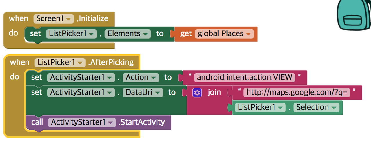 - Screen1에서 when .initialize와 when.AfterPicking을 가져오고 when .initialize에 ListPicker1에서 Elements to를 가져와서 끼우고 variables에서 get global Places을 가져와서 끼우기