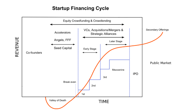 과연 스타트업에 투자한 초기 투자자들은 언제쯤 수익실현에 돌입 할까요? 이 부분에 관해 이야기를 해보고자 합니다. 제가 겪어본 스타트업의 경우 투자유치 관한 곡선과 단계는 위 그림과 유사합니다. 처음 창업이 시작되고 자금을 여러 곳에서 지원을 받습니다. 초기 단계에는 운좋게 엔젤투자자로부터 투자를 받기도 하지만 FFF 즉 Family, Friends, Foolish 에게서도 투자를 받는 것이 대부분이라고 합니다. 그리고 그 단계를 지나 시리즈 A, B 와 같은 얼리 스테이지를 지나 시리즈 C, 그리고 주식과 채권의 경계선인 메자닌 투자를 받아 최종적으로 IPO 를 목표로 진행하게 됩니다.