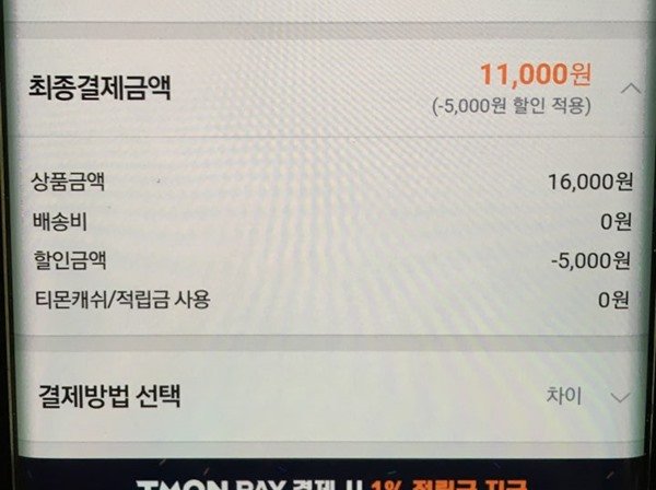 티몬에서 0원 할인받고 11000원 결제합니다