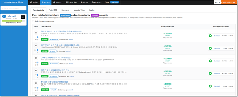 자신의 팔로워들의 글과 자신이 투표한 글들의 정보가 뜬다