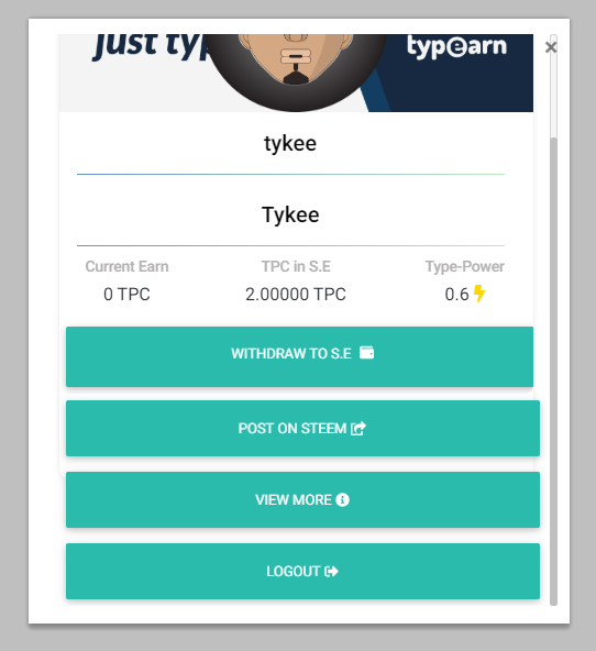This component shows the amount of the TPC that has been earned through the typing tests, and it can be claimed to user Steem-engine wallet by a click on the Withdraw to S-E button that is provided below the component.