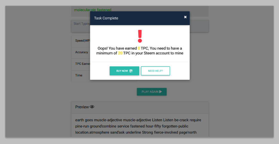 This is the section to mine while improving your typing skills. There are chances of mining five times in 24 hours. The number of words typed, and your typing speed will determine the amount of Typecoin you will earn. The additional and smart way to maximize your earnings is to hold a tangible amount of Typecoin in Steem-engine wallet. The amount of Typecoin in your Steem-engine wallet is converted to the Typepower by default which will be added to the volume of TPC you will be earning.