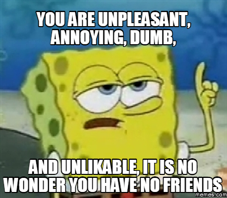 You are unpleasant, annoying, dumb, and unlikable, It is no wonder you have no friends.