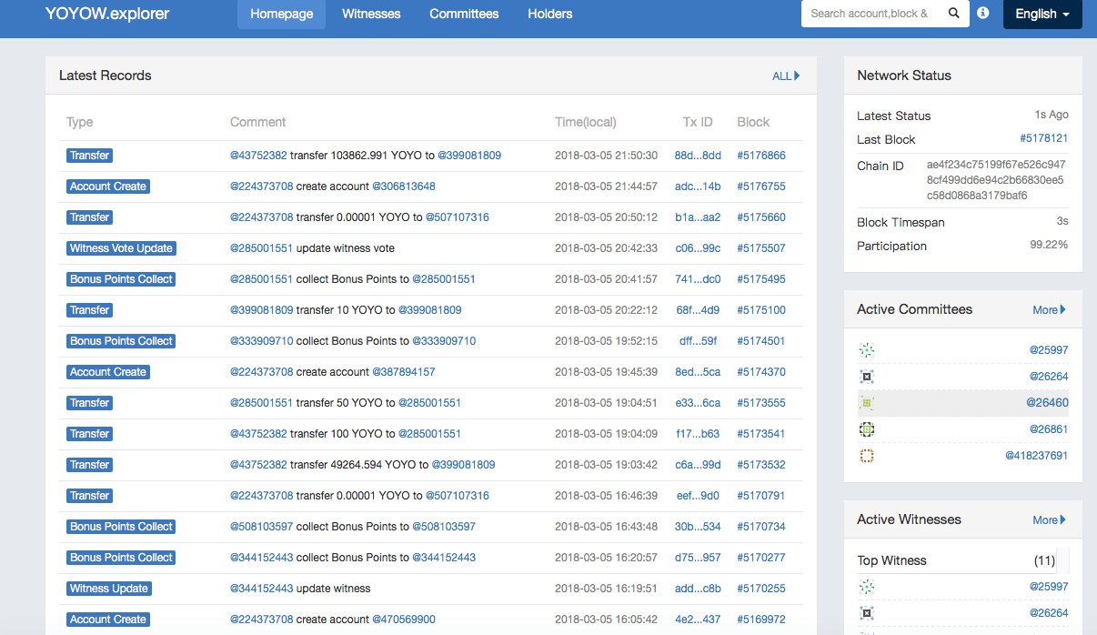 区块链浏览器已经做出来了:https://yoyow.bts.ai/?locale=en
