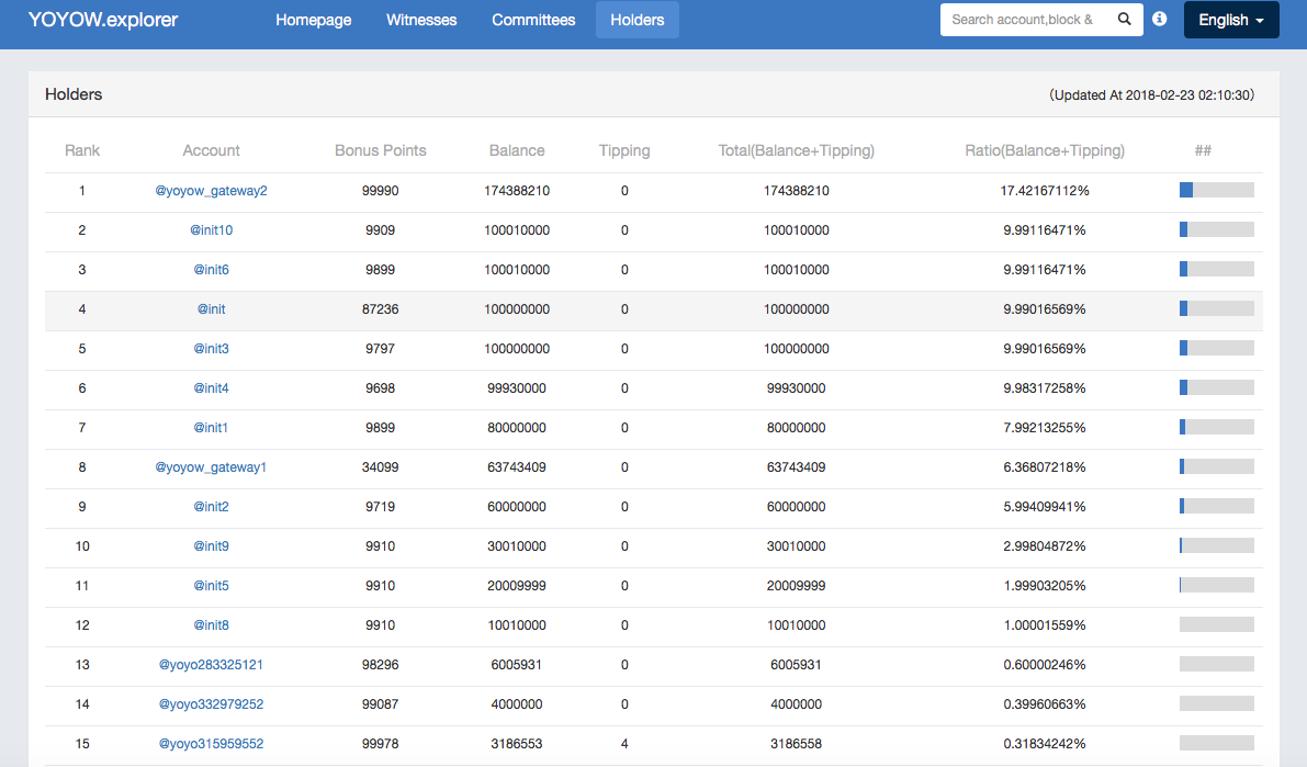 据我判断前12个账号应该都是官方的,总计持有了约93%的币,YOYOW总计10亿个币,分布在外面的只有约7000万个,为什么官方持有这么多?我查阅相关资料判断原因是这样的:去年9月份中国严查ICO,YOYOW官方被迫退币,收回了大部分已经ICO出去的币,只有一部分流落在外面没有收回,这说明去年官方募集到的资金并不是很多(相对于其他ICO项目)。