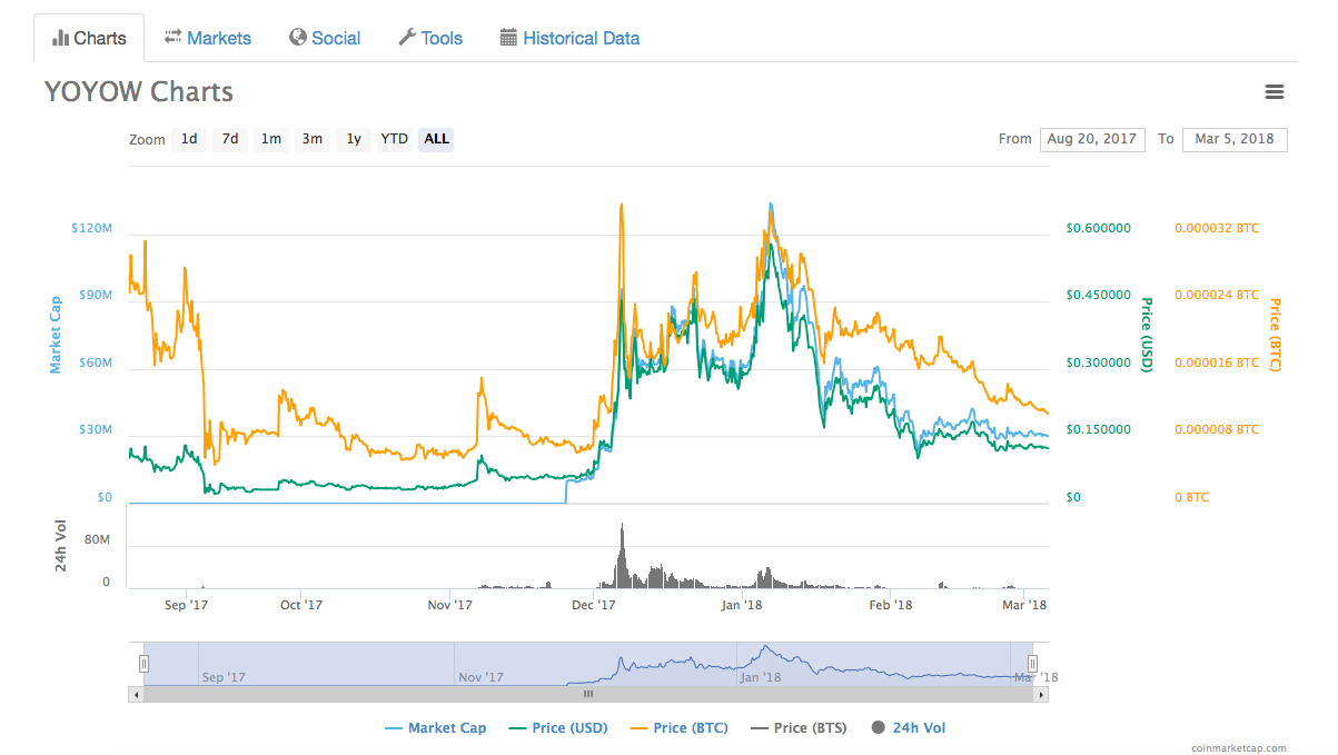YOYOW总量10亿个,目前币安交易价约0.8元一个,总市值8亿,最近价格也跌得有点惨: