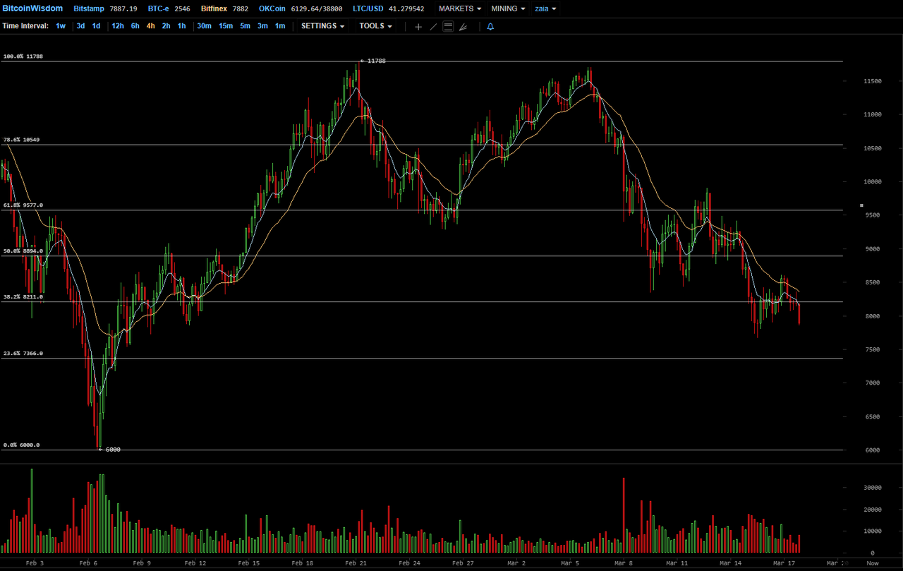 Things could be looking pretty good for a recovery! The support is defintely holding around 8000-8200 and the price does seem to be in a shockwave pattern around that median level. This price also lines up with the 38.2% Fibonacci drawn between 11700 and 6000. Looking at the other levels, one can expect the price to play around 7360 for a bit too, if it decides to head back down and retest 6k.